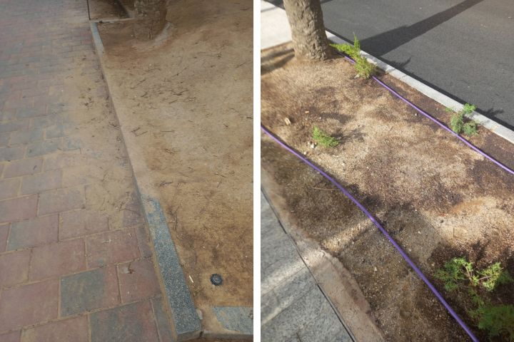 Pero hay un detalle que pasa bastante desapercibido y es el diseño de los espacios ajardinados y de los nuevos alcorques; los primeros, limitados por bloques cuando son frontera con las calzadas y en el interior, siguiendo la línea de otros anteriores, por una estructura de acero, un cuadrilátero en el caso de árboles, instalado a ras del suelo. En ambos casos, la tierra está prácticamente al mismo nivel, con lo cual ya se producía y se seguirá produciendo un desparrame fuera de su entorno natural, bien por las lluvias, el viento y, sobre todo, por la intervención de los perros cuando la patean. Algo que se podría evitar con la elevación de esos límites en cualquiera de los dos materiales utilizados. Me temo que, cuando vayan progresando en los siguientes “ejes” de obras en los que está inmersa la ciudad, siga proliferando el diseño y nos encontremos con más suciedad en torno a esas pequeñas zonas verdes.