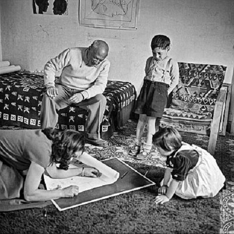 Pablo Picasso observa cómo pinta Gilot junto a Paloma y Claude que miran también atentamente (Fuente: RTVE).