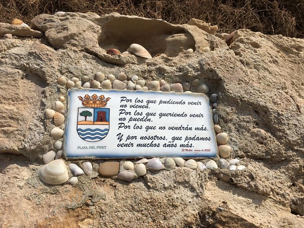El Mollet es un antiguo y pequeño muelle casi derruido desde el que se cargaban barcazas de sal marina llevándola hacia buques más grandes que, por su calado, no podían acercarse a la salina que allí aún funciona. Es costumbre de los naturales de la zona y de los que la visitamos recorrer la orilla en paralelo al parque natural desde el epicentro de El Pinet hasta ese espigón donde alguien ha colocado este año un azulejo que hace referencia a esos paseos.