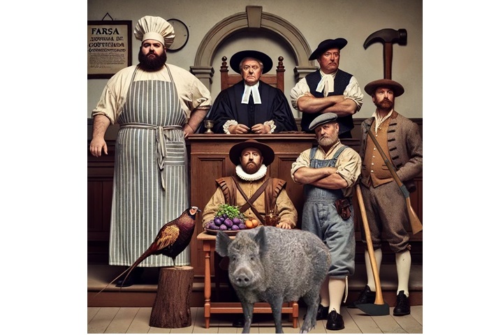Corregidor: Calma, cazador, que la ira es mala consejera. Juzguemos serenamente. Por lo pronto, las tres afirmaciones que ha hecho el acusado podrán ser sospechosas, pero “in principio” son indiscutibles. ¿Puede alguien negar que un faisán coma ciruelas?