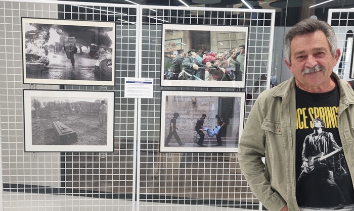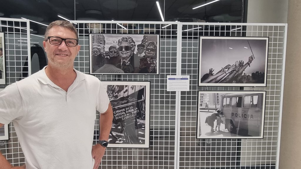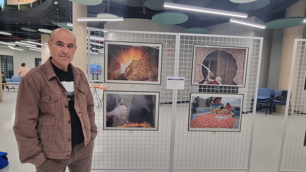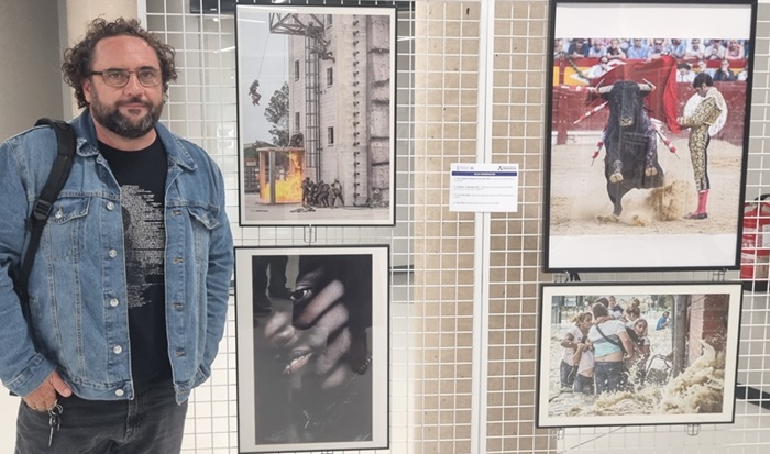 El fotoperiodista Rafa Arjones posa ante su panel de instantáneas para la exposición «Fotoperiodismo del siglo XXI. Imágenes que hacen historia» (Redacción).