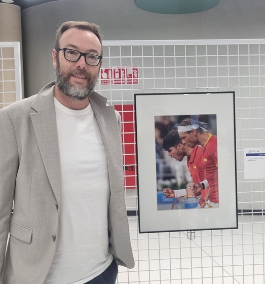 Y por último, y no por ello menos importante, la guinda de esta exposición la pone nuestro colaborador José Luis Pérez, fotógrafo deportivo que con su Nadalcaraz fue portada nacional y viral internacional llevando la imagen de los dos tenistas españoles (Rafa Nadal y Carlitos Alcaraz) por todo el mundo. La icónica instantánea fue seleccionada entre las 10 mejores del año (Premios AIPS). El hecho de que nos la regalara a la APPA fue probablemente el momento en que comenzó a gestionarse esta exposición destinada a acompañar a los reyes de la raqueta en las paredes de la sede.