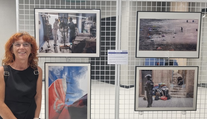 La fotoperiodista Pilar Cortés posa ante su panel de instantáneas para la exposición «Fotoperiodismo del siglo XXI. Imágenes que hacen historia» (Redacción).