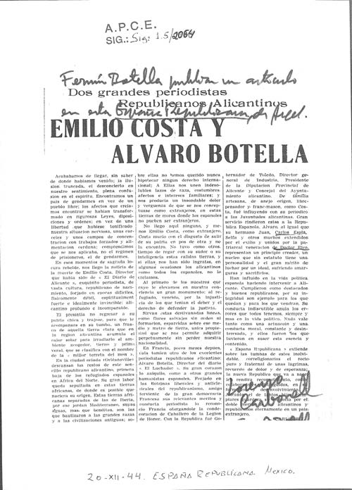Se dijo de él que era “exquisito periodista, de vasta cultura, forjado en épocas difíciles, físicamente débil, espiritualmente fuerte, idealmente invencible, alicantino profundo e incomparable” (artículo en España Republicana, México, 20-12-1944)
