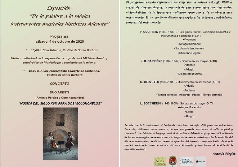Quedan por realizar tres jornadas con visita guiada y concierto, en el próximo mes, el 8 de noviembre y el 13 de diciembre. En el caso de la próxima, que tendrá lugar el 4 de octubre a las 19:00 h, tras el recorrido guiado por la exposición realizado por José María Vives, uno de sus comisarios, el concierto se celebrará en el aljibe renacentista de mediados del siglo XVI del Castillo de Santa Bárbara. La actuación musical correrá a cargo del Dúo Aresti, compuesto por los músicos formados en los conservatorios de Alicante y Rotterdam, Coro Hernández y Antonio Pérglez, quienes explorarán «el fascinante repertorio del siglo XVIII para dos violonchelos», en palabras del propio Pérglez, y acercarán a los asistentes «al estilo original» y reproducirán con fidelidad «el lenguaje musical de la época». El programa del concierto, con obras de François Couperin (1668-1733), compositor, organista y clavecinista francés del Barroco; Jean-Baptiste Barrière (1707-1747), violonchelista y compositor francés; Giacobbe Cervetto (1682-1783), destacado violonchelista y compositor de violonchelo en la Inglaterra del siglo XVIII, y Luigi Boccherini (1743-1805), compositor y violonchelista italiano afincado en España desde muy joven, «está ordenado de forma cronológica […] para poder apreciar la evolución del discurso compositivo, desde los primeros ejemplos del barroco temprano hasta obras más tardías, mostrando cómo la técnica del arco se adapta y transforma al servicio de la expresión musical» termina Pérglez.