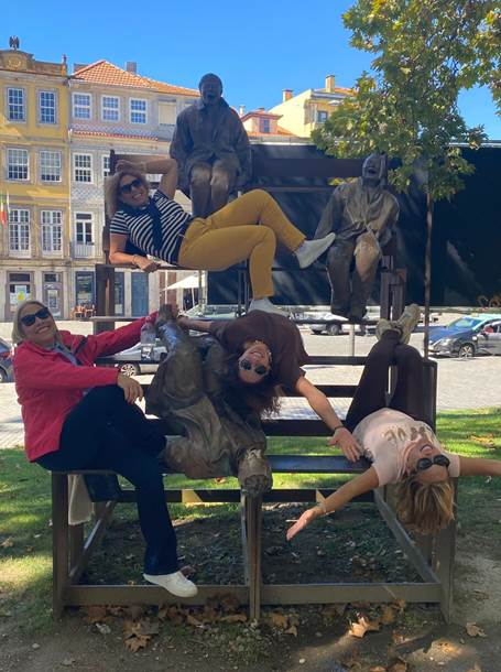 Al continuar el camino, atravesamos un pequeño parque donde algunas de nuestras compañeras del grupo, contagiadas por el ambiente alegre de la mañana, decidieron imitar con mucho arte el mobiliario urbano, convirtiendo aquel momento en una escena tan espontánea como divertida. Sin duda, quedaron todas muy graciosas, arrancando carcajadas y fotografías que quedarán para el recuerdo.