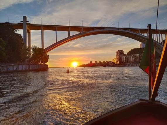 Cuando el sol comenzaba a despedirse, nos embarcamos en un crucero por los seis puentes, navegando sobre las aguas del Duero mientras la luz dorada de la tarde iba tiñendo el horizonte. Y como colofón, la suerte nos regaló una postal inolvidable: la puesta de sol en la desembocadura del río, en el extremo más occidental de Europa.