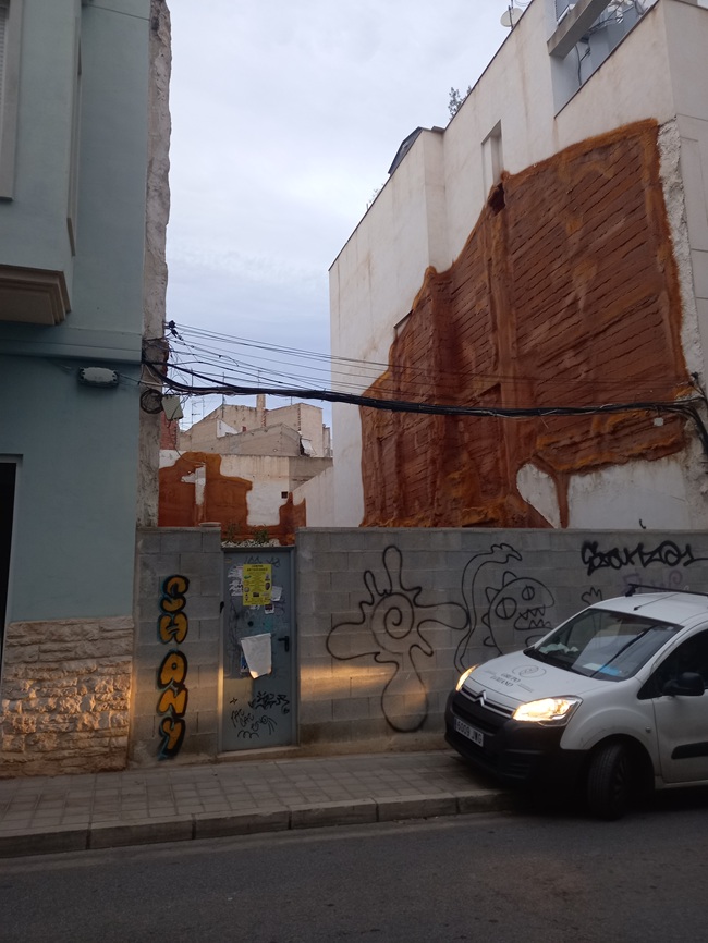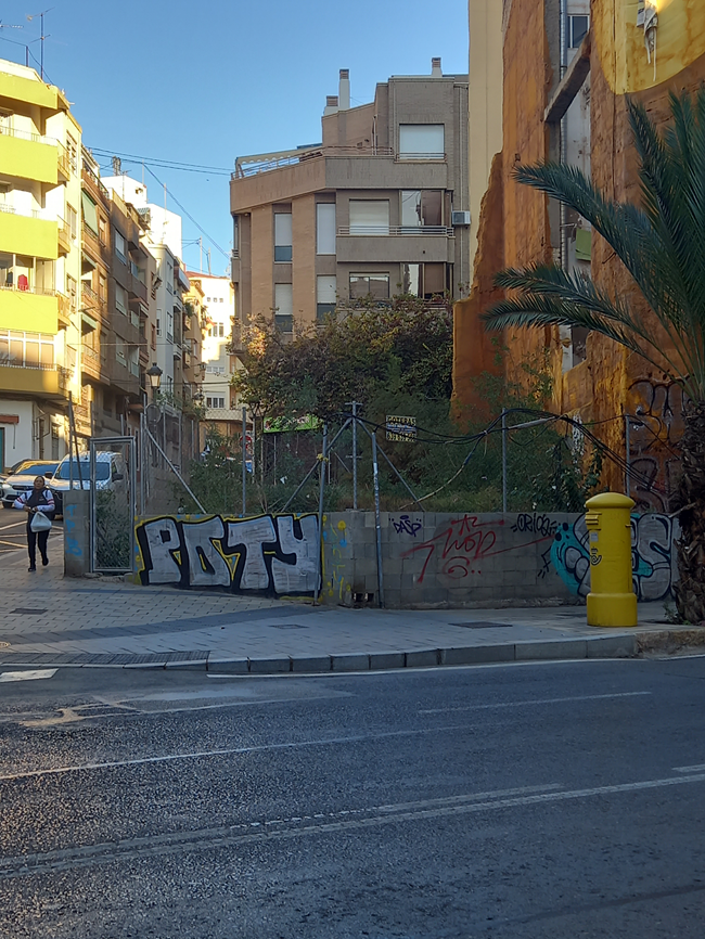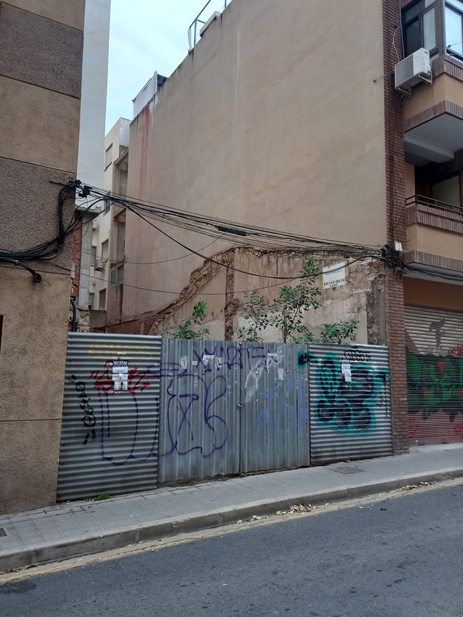 Algo más arriba, en la calle Capitán Hernández Mira, nos saluda una obra en paro desde hace algún tiempo y, algo más allá, un buen solar también en espera de algún proyecto, “decorado” con los cables eléctricos y telefónicos colgando. Y hay algunos solares más arriba, en la calle Díaz Sanchís, también “cableados”.