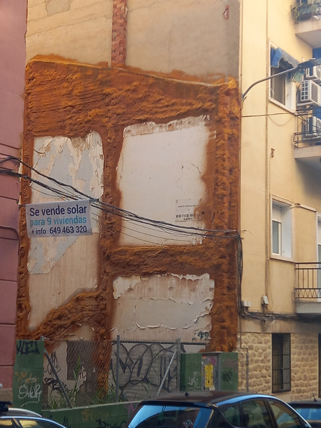 Tan cerca del centro, digo, que debería acoger más de un proyecto de obras para los solares que presenta, el primero de ellos casi enfrente de la iglesia con colegio anexo de los Franciscanos. Poco más arriba, a no muchos metros de la sede de Izquierda Unida, en la confluencia de la calle de Sargento Vaillo con Padre Mariana, una gran casona medio abandonada y quizás medio ocupada llama la atención por su deterioro externo y muy cerca un solar en venta para “9 viviendas”.
