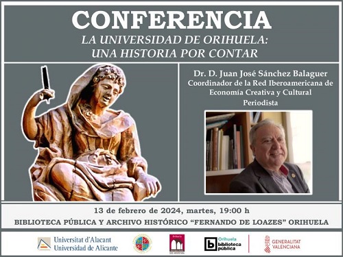 Sin excusa (con mi presencia), por mi apoyo a toda reivindicación hacia el bienestar en Orihuela y la Vega Baja, este martes 13 de febrero (19:00 h en la Biblioteca Pública Fernando de Loazes) acudo a la conferencia La Universidad de Orihuela: una historia por contar, de Juan José Sánchez Balaguer (coordinador de la Red Iberoamericana de Economía Creativa y Cultural). El oriolano nos expondrá con detalle diferentes causas (numerosos proyectos y promesas pendientes desde 1998, con 10 incumplimientos y 40 conclusiones). El objetivo último, todos lo deseamos, es la eliminación del riesgo de clausura del campus universitario de Las Salesas en la ciudad.