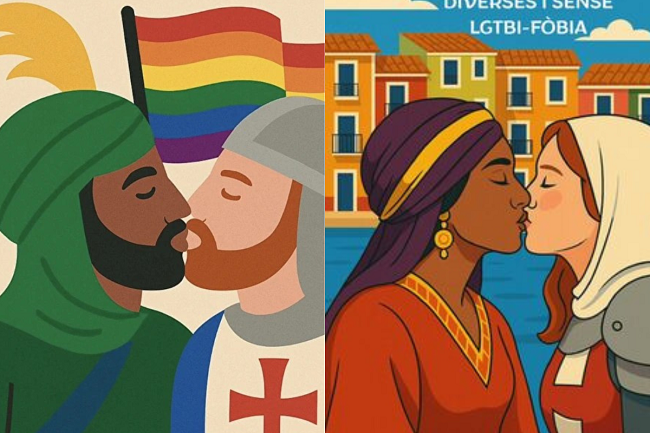 Otra cosa que también me ha llamado mucho la atención son los carteles que promocionan las fiestas de Moros y Cristianos de Villajoyosa, con LGTBI moros y cristianos homosexuales besándose; tanto dos chicos como dos chicas y con la bandera de colores detrás. A ver, uno puede ser más o menos liberal, pero es que no cabe el sentido común en ese cartel para promocionar unas fiestas, que no es la fiesta del beso intercultural, que las fiestas no tienen nada que ver con besarse. Y digo yo, metidos a ese nivel, ¿ya no pueden aparecer un hombre y una mujer besándose?, ¿ya tiene siempre que ser la misma cantinela todo el tiempo? Está claro que es para llamar la atención, porque es que no hay relación fiestas de ese tipo y beso y homosexual, y creo que, en otros actos sí, pero en otros, como en este caso, es una metedura de pata, que el autor o autora ha tenido su momento de gloria. Pues vale, pero dudo mucho que pueda considerarse un artista, tan sólo es el «venga, vamos a llamar la atención para que se quejen los de siempre». Bueno, es lo que hay.